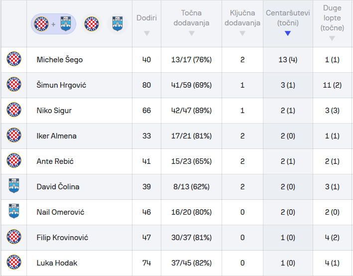 Hajduk je u ovoj utakmici uputio 25 centaršuteva i pogodio 7 puta što je uspješnost od 28% (i napredak u odnosu na prošlu), a Osijek je nabacio 7 puta i bio uspješan samo 1 put (14% uspješnosti). Više od pola Hajdukovih centaršuteva pada na Šegu, koji je uputio 13, od toga 4 točno. Sigur i Rebić su po jednom uspješno nabacili iz 2 pokušaja, a Hrgović jednom iz 3 pokušaja. Ostali nisu bili precizni. Kod gostiju je samo Bukvić jednom uspješno ubacio iz jednog pokušaja.