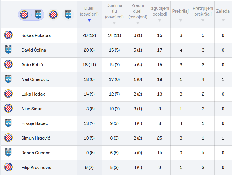 Hajduk je bio uspješniji u ukupnim duelima s 58% naspram 42%, a prva petorica pojedinaca su sve bili Hajdukovci. Rokas Pukštas je nastavio tamo gdje je stao, te je bio predvodnik u duelima i u ovoj utakmici – osvojio ih je 12 od 20. Zatim slijedi Ante Rebić s 11 od 18, Luka Hodak s 9 od 14, Niko Sigur s 8 od 13 i Filip Krovinović sa 7 od 9. Prvi Osijekov igrač je Hrvoje Babec sa 7 od 13 uspješnih duela.