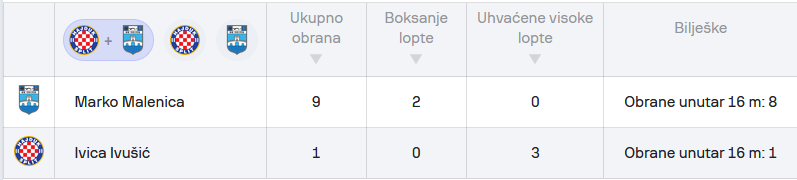 Ivica Ivušić je imao jako malo posla, samo jednu obranu, no uhvatio je tri visoke lopte i zadržao clean sheet, sada već osmi u trinaest kola. Njegov kolega Malenica, s druge strane je imao pune ruke posla, te je za devet obrana (od kojih je 8 bilo unutar 16 metara) postavio rekord ovogodišnjeg SHNL-a za najviše obrana u jednoj utakmici. Imao je još i 2 boksanja lopte.