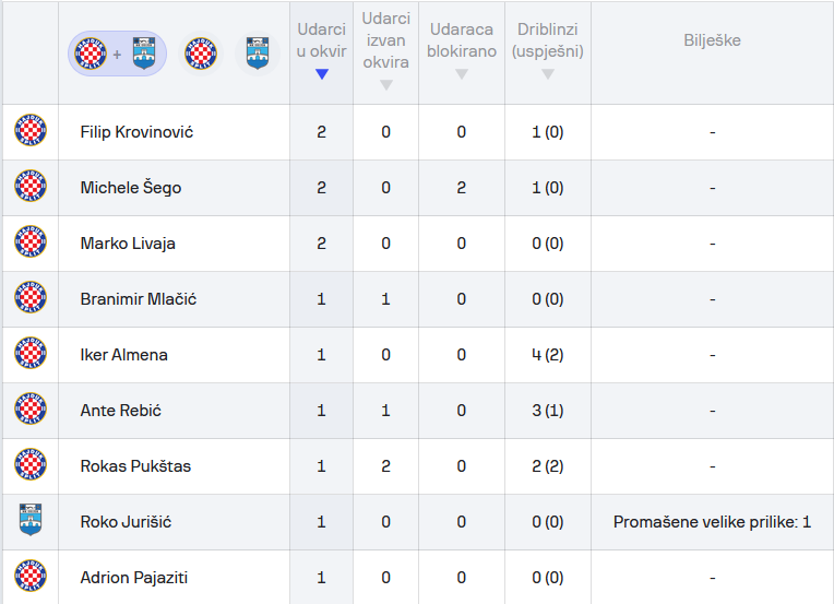 Hajduk je u potpunosti dominirao s 23 upućena udarca, naspram pet Osijekovih. Još je impresivnija ta dominacija kad se vidi 11 udaraca unutar okvira, naspram jednog Osijekovog. Još je spektakularnije vidjeti 45 ulaska u protivnički šesnaesterac Hajduka naspram 6 Osijekovih ulazaka. Strijelci Krovinović i Šego, uz Livaju, imaju upućena dva udarca unutar okvira. Slijede ih Mlačić, Almena, Rebić, Pukštas, Pajaziti, te jedini među Osječanima Jurišić, koji je ujedno i isključen, drugim žutim kartonom u 65. minuti.