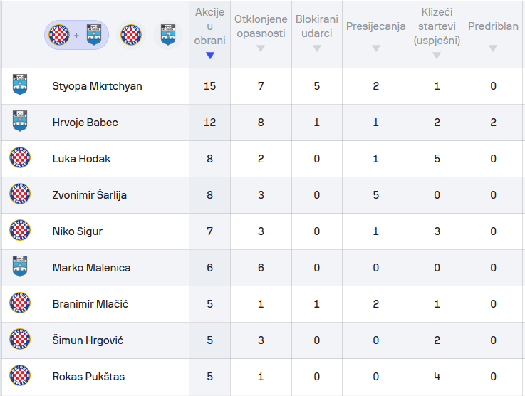 Osijekov Mkrtchyan je predvodio obrane obje momčadi s 15 obrambenih akcija, slijedi ga njegov kolega Babec s 12, Hodak i Šarlija su na diobi trećeg mjesta s po osam obrambenih akcija, s tim da je Šarlija prvi po presječenim loptama s njih pet.