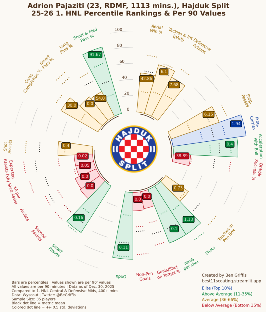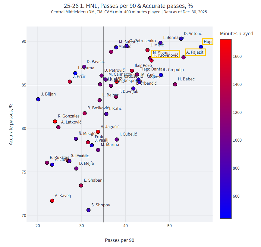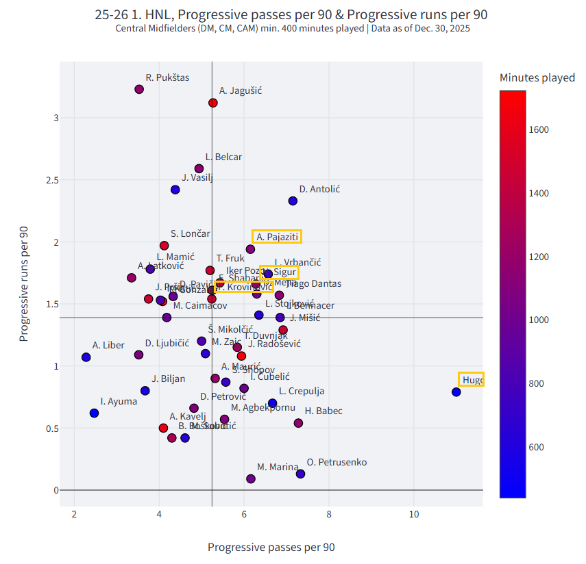 Pajaziti je iznadprosječan u progresivnim dodavanjima, a u prenošenjima je najbolji među Hajdukovcima i u samom vrhu lige. Sigur je također iznadprosječan u obje kategorije. Krovinović je čisti prosjek u dodavanjima, a iznad prosjeka po pitanju prenošenja. Konačno, Guillamon je ispodprosječan po pitanju prenošenja, a po pitanju progresivnih dodavanja po 90 min je najdominantniji igrač lige.