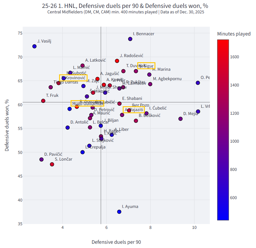 Sigur je ovdje jedini natprosječan u obje kategorije i spada u najbolje duel igrače među veznjacima. Pajaziti je iznadprosječan u broju duela u koje ulazi, a ispodprosječan u postotku uspješnosti. Za Krovinovića je situacija obrnuta: ne ulazi u puno duela, ali u dosta njih izlazi kao pobjednik. Konačno, Guillamon je ispodprosječan u obje kategorije.