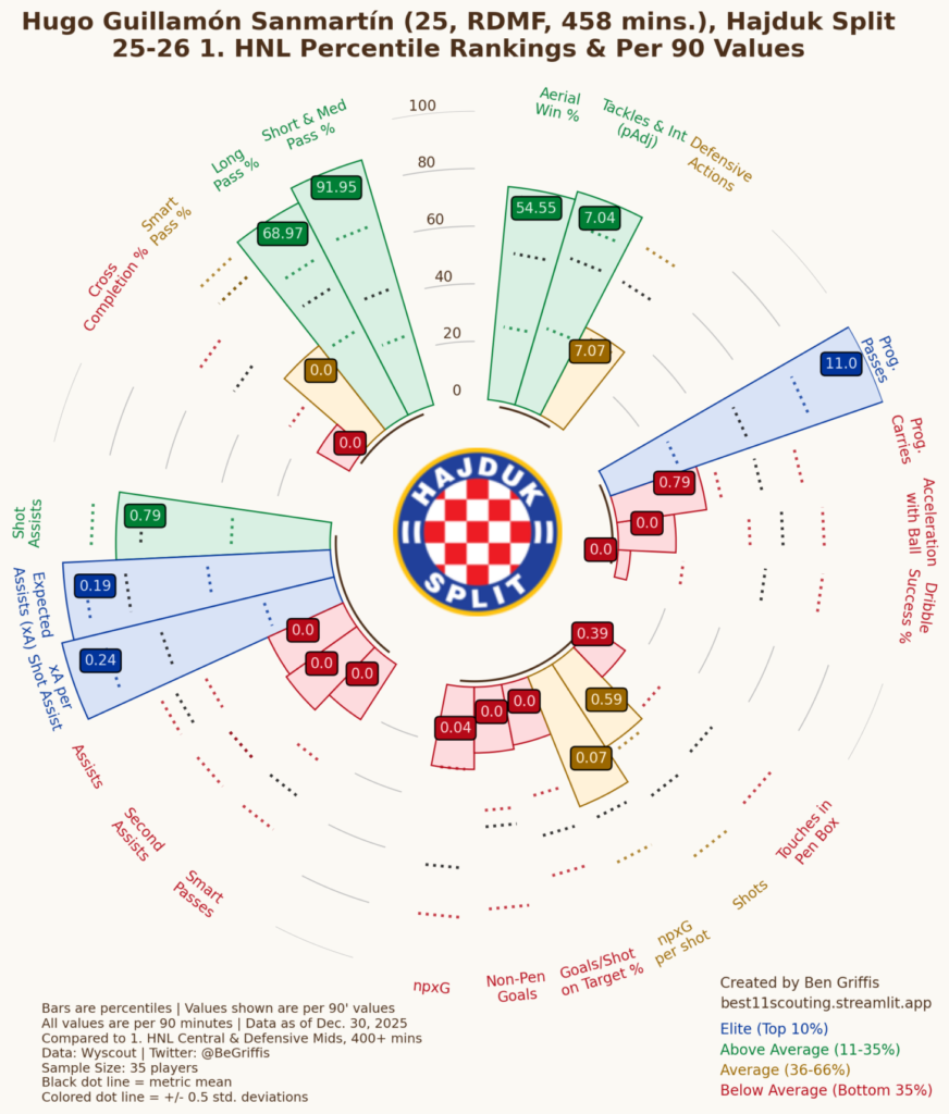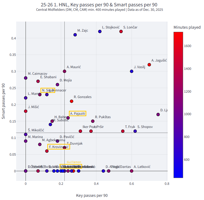 Pajaziti je od Hajdukovaca jedini iznadprosječan u obje kategorije. Sigur je ispodprosječan u pametnim dodavanjima, ali ispodprosječan u ključnim dodavanjima. Krovinović je ispodprosječan u obje kategorije. Konačno, Guillamon nema pametnih dodavanja i tu je na samom dnu, ali je gotovo prosječan po pitanju ključnih dodavanja.