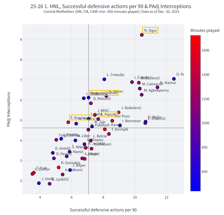 Sigur je ukupno najdominantniji igrač u ove dvije kategorije, ali ne treba zaboraviti da je neke utakmice odigrao na poziciji braniča zbog čega može imati nešto bolju statistiku u kontekstu obrane. Guillamon je prosječan u obrambenim akcijama, ali natprosječan u presijecanjima. Pajaziti je blago iznadprosječan u obje kategorije, a Krovinović je blago ispodprosječan u kategoriji obrambenih akcija.