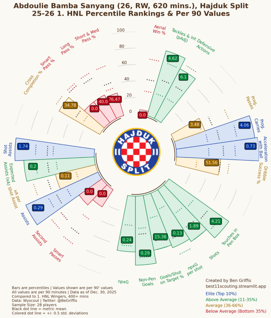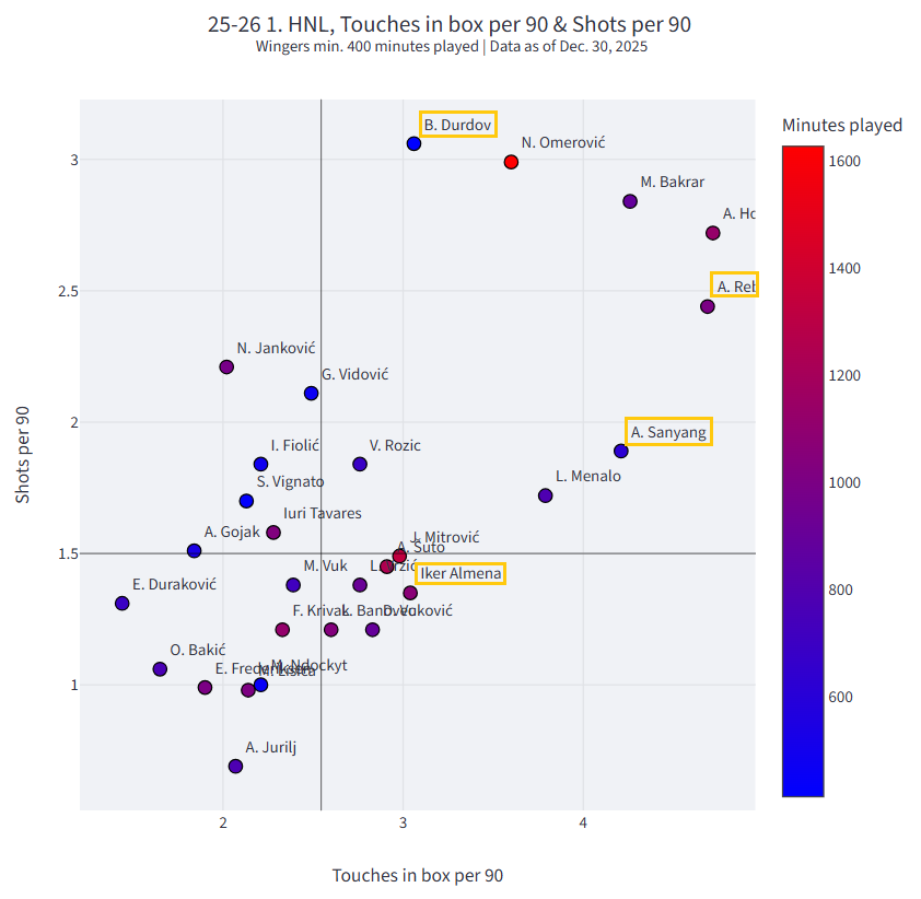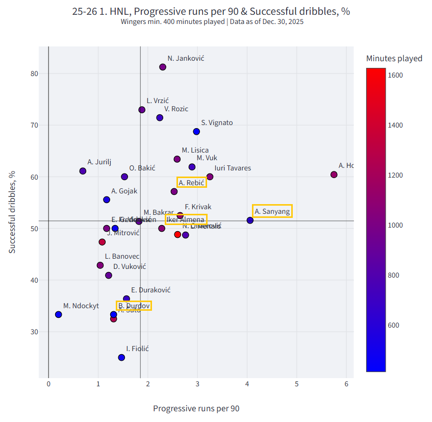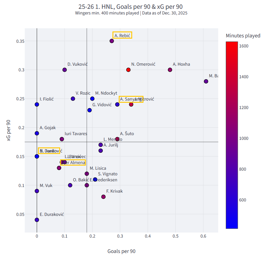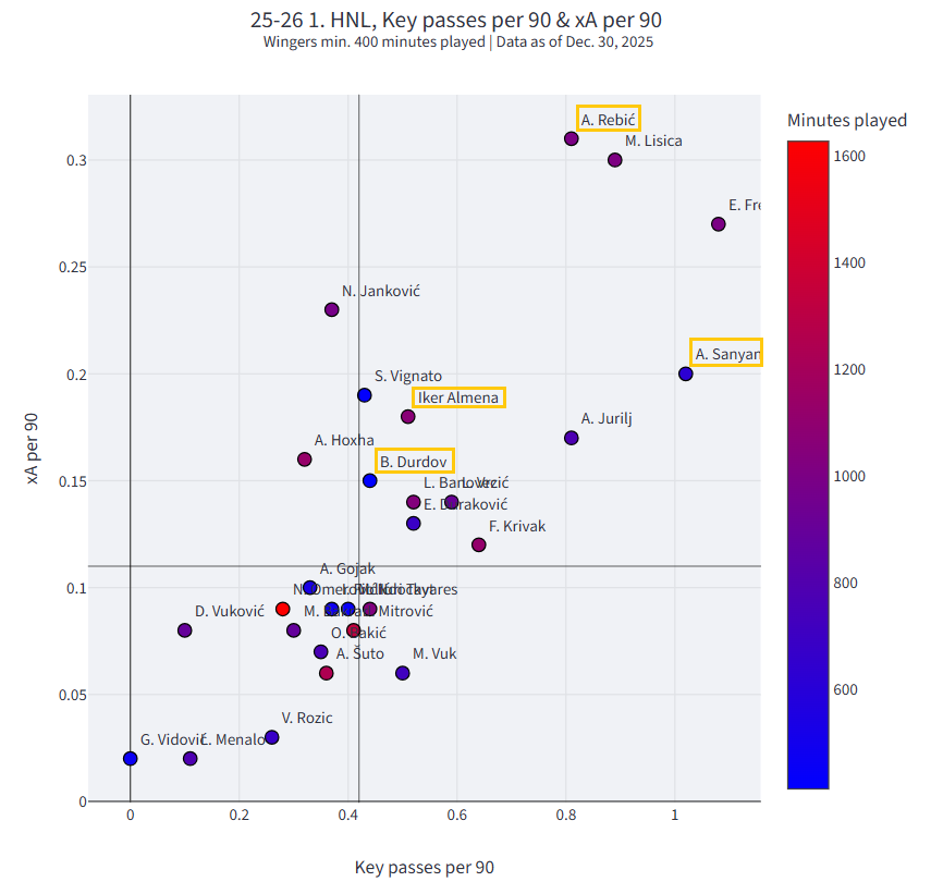 U drugom dijelu obradit ćemo krilne pozicije. U obzir ćemo uzeti krila koji su odigrali 400 i više minuta kako bi u analizi bili uključeni Abdoulie Sanyang “Bamba”, Ante Rebić, Iker Almena i Bruno Durdov. Roko Brajković radi odigravanja manje od 100 minuta neće biti razmatran u ovoj analizi.