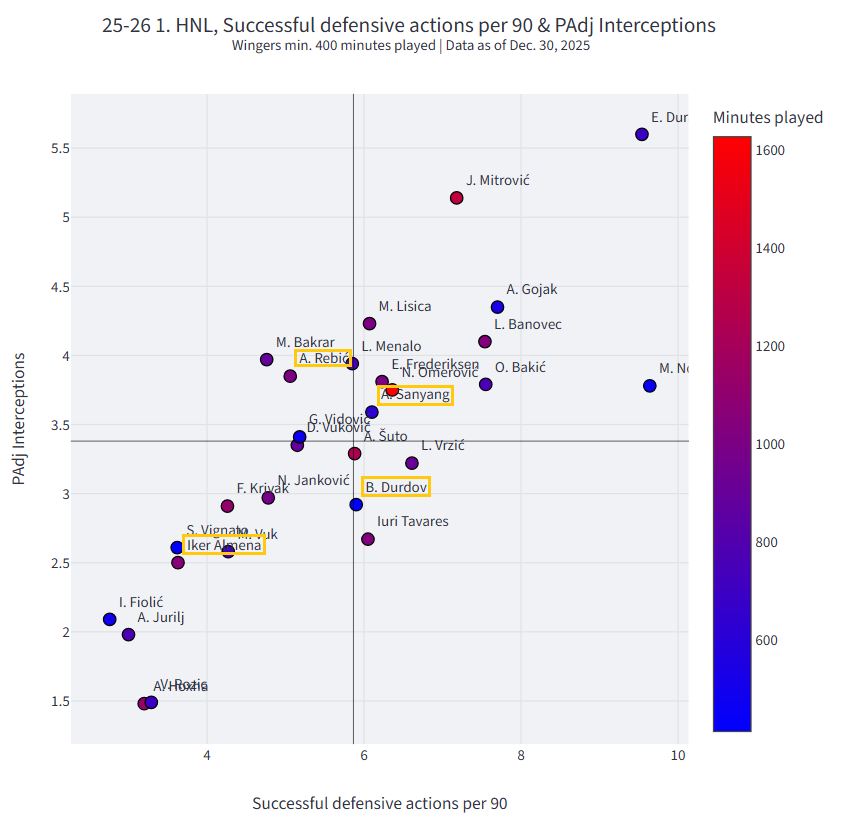 Almena je jedini koji je ispodprosječan u obje kategorije. Durdov je ispodprosječan po pitanju presijecanja, ali je mrvicu iznad prosjeka po pitanju obrambenih akcija. Rebić je ispodprosječna kod obrambenih akcija, a iznadprosječan kod presijecanja. Bamba je jedini iznadprosječan u obje kategrije, ali je daleko od najboljih pojedinaca u ligi.