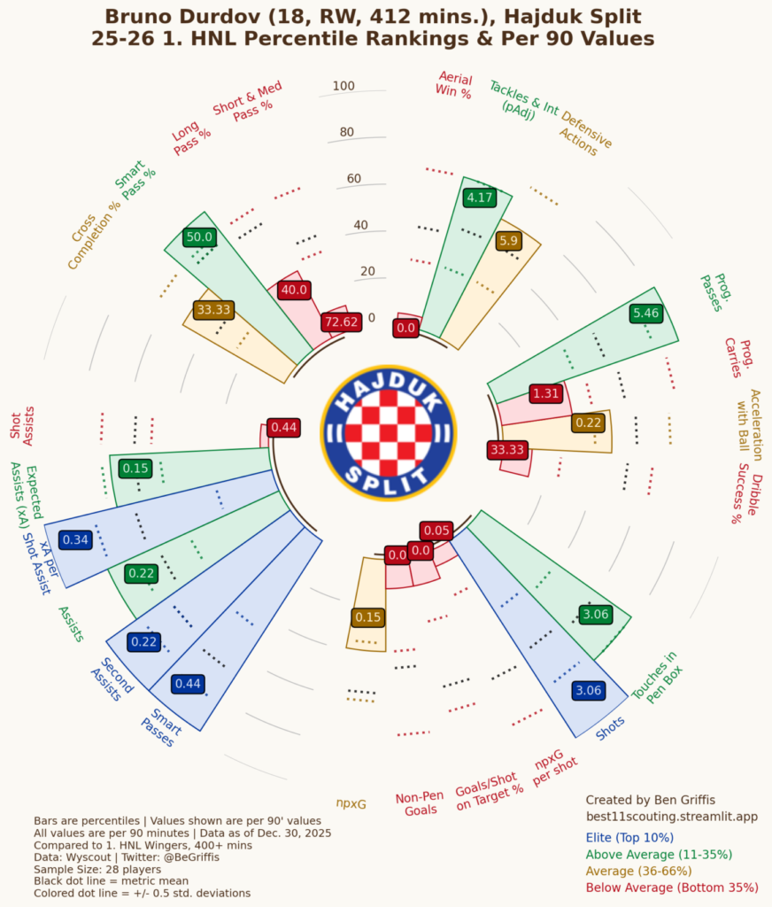 S malo više od 400 odigranih minuta durdov je elitan u broju udaraca, pametnim dodavanjima, predasistencijama te očekivanim golovima po asistencijima za udarac. Iznadprosječan je po oduzetim loptama i presijecanjima (oboje prilagođeno posjedu), progresivnim dodavanjima, broju dodira u šesnaestecu, asistencijama, očekivanim asistencijama te postotku točnih pametnih dodavanja.