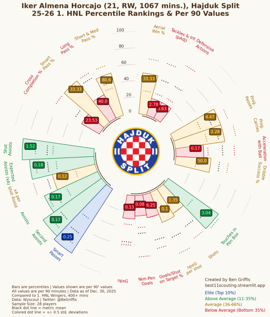 Zimska stanka je trenutno i dok se igrači pripremaju za nastavak sezone, mi ćemo se osvrnuti na igre prvog dijela sezone i staviti igrače Hajduka u odnos s drugim igračima lige. Podaci koje ćemo koristiti bit će oni od wyscouta alata za sportsku analitiku.