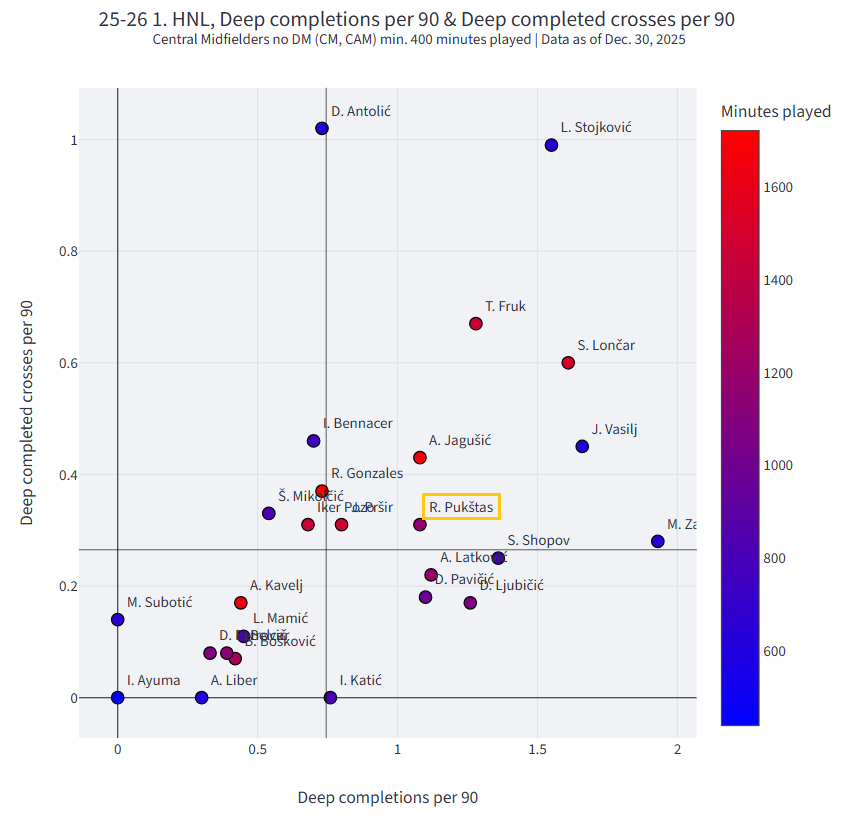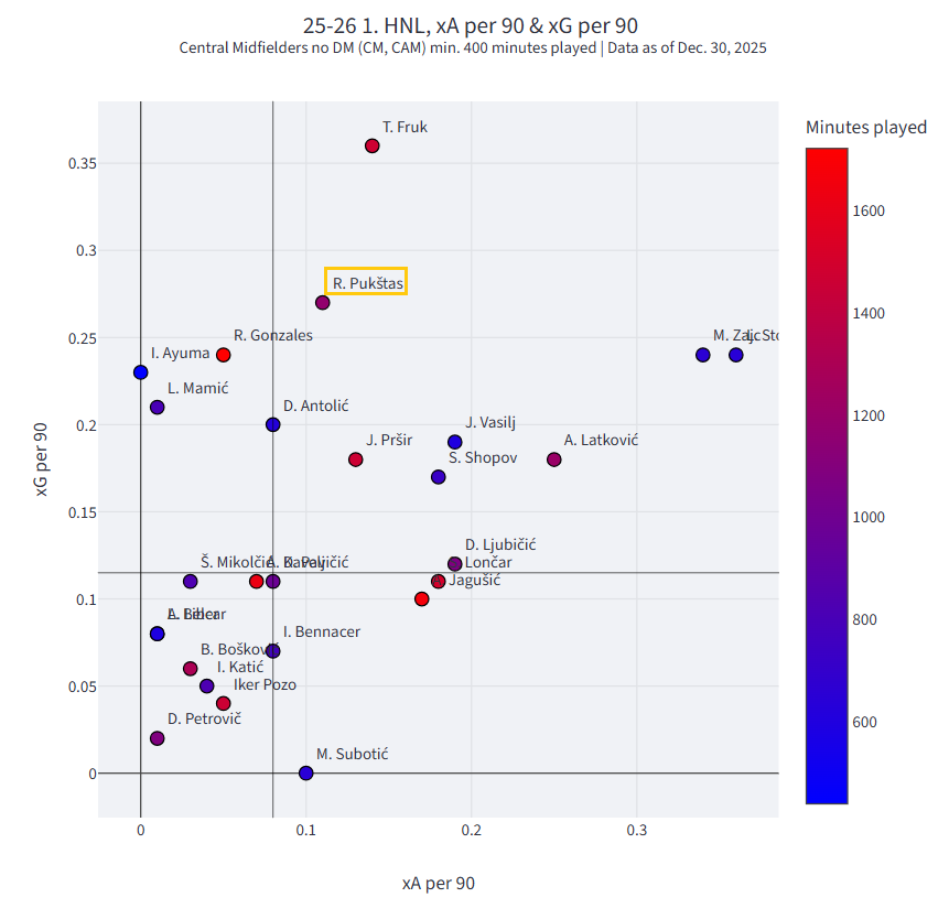 U drugom dijelu obradit ćemo poziciju ofenzivnog veznog. U obzir ćemo uzeti samo Rokasa Pukštasa i ostaviti 400 minunta igre kao normu za usporedbu igrača radi konzistentnosti. Anthony Kalik ne ulazi u izbor radi samo 266 odigranih minuta.
