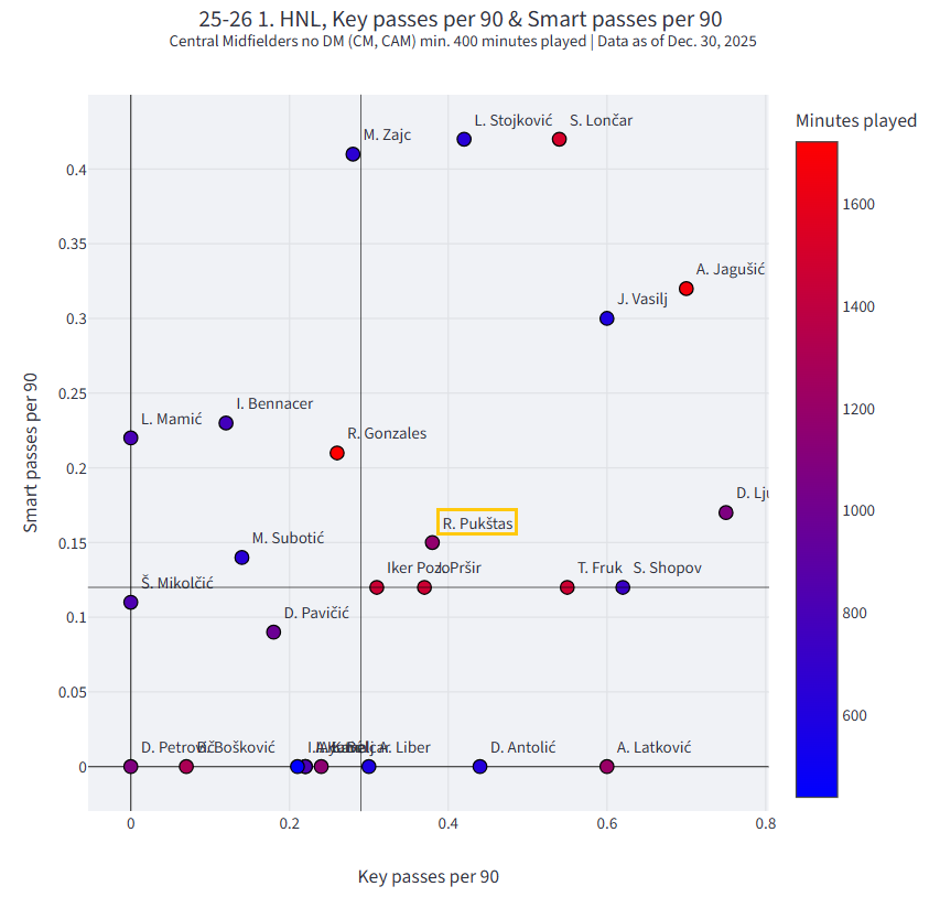 Pukštas je i ovdje blago natprosječan u odnosu na druge ofenzivne vezne u ligi, ali nimalo blizu najboljim pojedincima.
