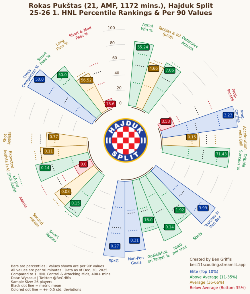Ako želimo odrediti najbolje pojedince po pozicijama na temelju sustava rangiranja bazirano čisto na statističkim podacima prikupljenim tijekom sezone, možemo koristiti model u kojem odabiremo najbitnije parametre za navedene pozicije i pripadajući faktor važnosti. Stavit ćemo Pukštasa kao jedinog Hajdukovog igrača u omjer s drugim ofenzivnim veznjacima koji su odigrali barem 400 minuta.