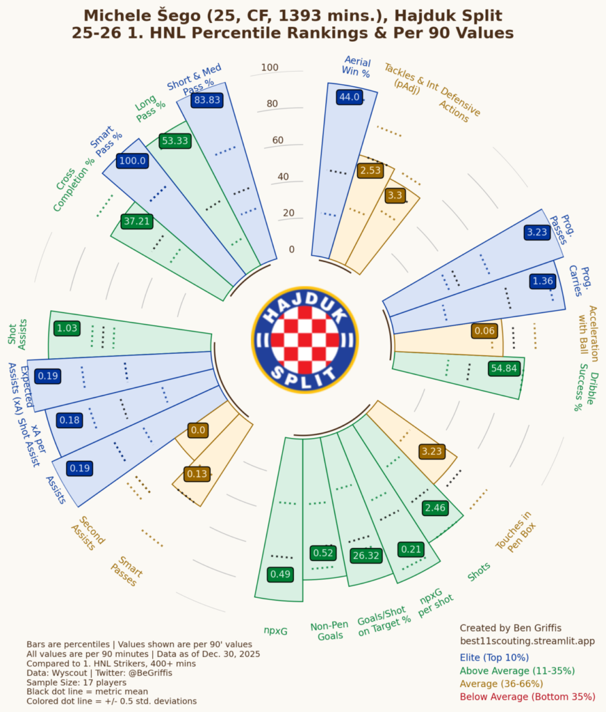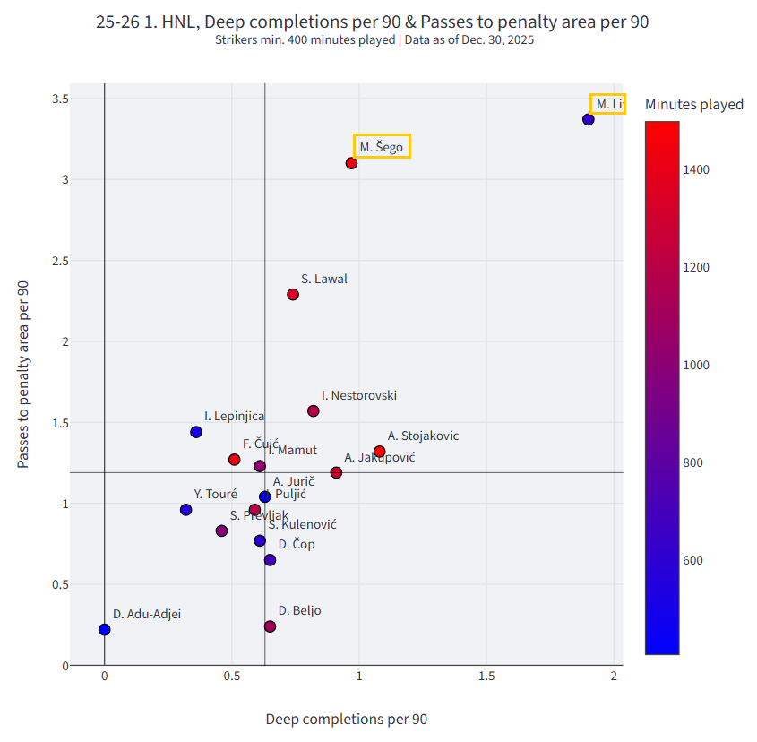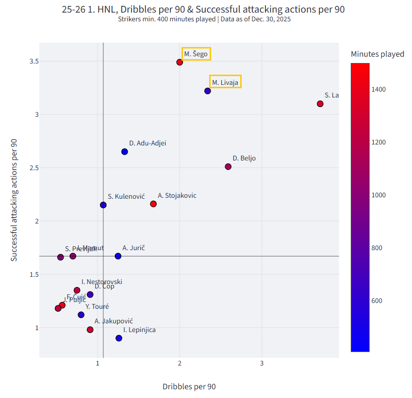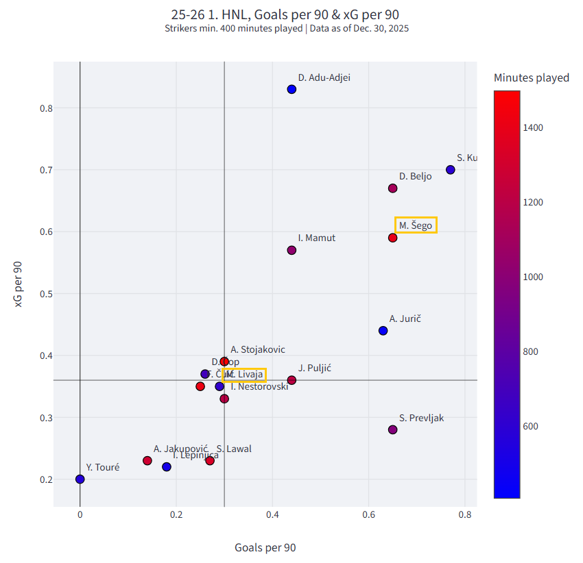 U drugom dijelu obradit ćemo poziciju napadača. U obzir ćemo uzeti samo Michelea Šegu i Marka Livaju. Uspoređivat ćemo ih sa svim napadačima koji su odigrali više od 400 prvenstvenih minuta ove sezone.