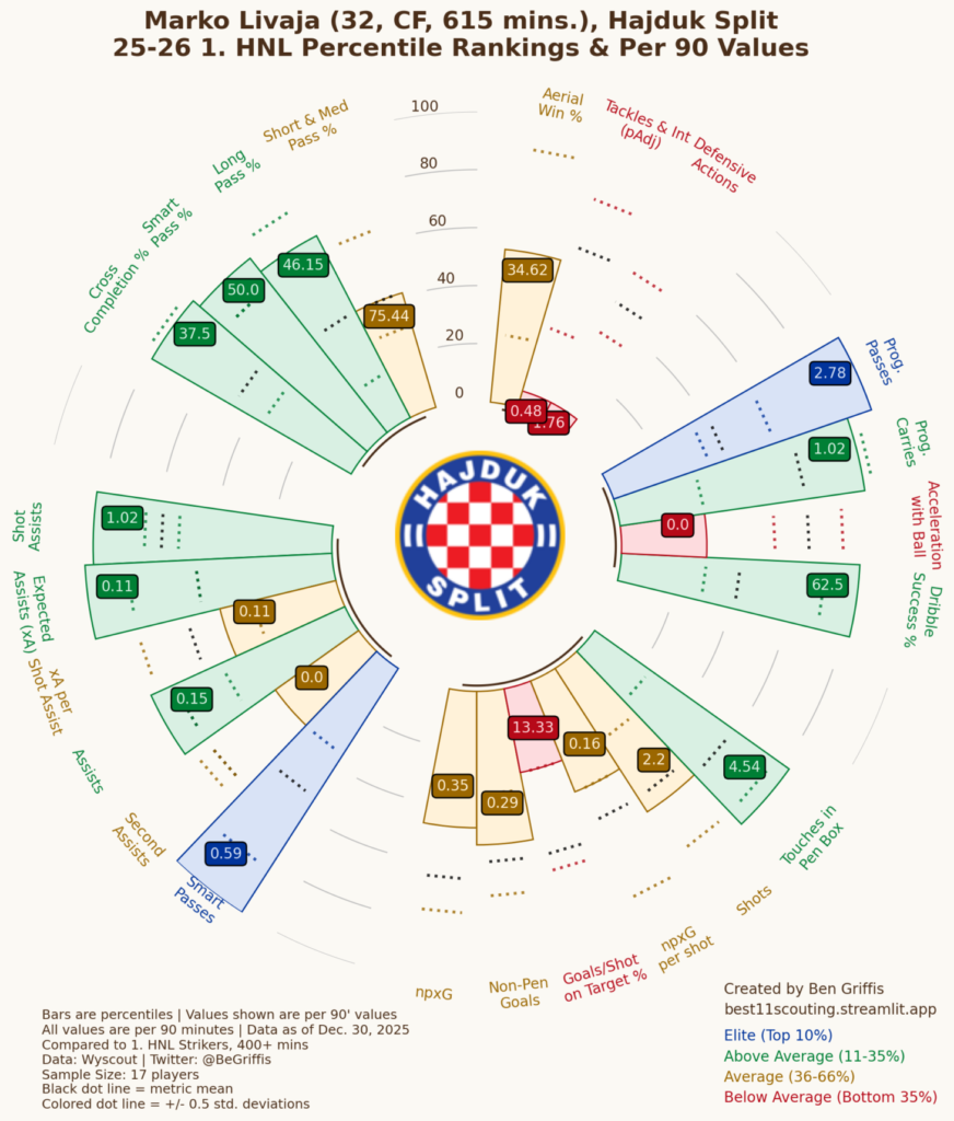 Livaja je u odnosu na druge napadače ove sezone elitan u progresivnim dodavanjima i pametnim dodavanjima. Iznadprosječan je u kategorijama: progresivna prenošenja, postotak uspješnih driblinga, dodirima u šesnaestercu, asistencijama, očekivanim asistencijama, asistencijama za udarce, postotku uspješnih nabačaja, postotku uspješnih pametnih dodavanja te dugim dodavanjima.
