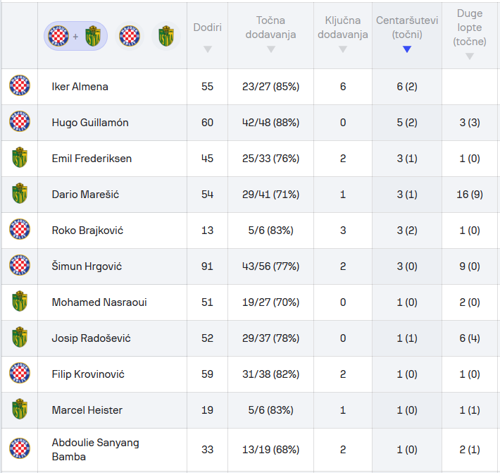 U centaršutevima Hajduk je bio uspješan 6 od 20 puta (30% uspješnosti), a gosti 4 od 14 puta (29%). Najuspješniji pojedinac bio je Roko Brajković s 2 od 3 uspješna centaršuta, zatim Hugo Guillamon s 2 od 5 i Iker Almena s 2 od 6 i to su ujedno jedini pojedinci u momčadi koji su uspješno centrirali. Kod Istre su uspješno centrirali stopostotni Ahmeti i Hiester (1 od 1), te Marešić i Frederiksen (1 od 3).