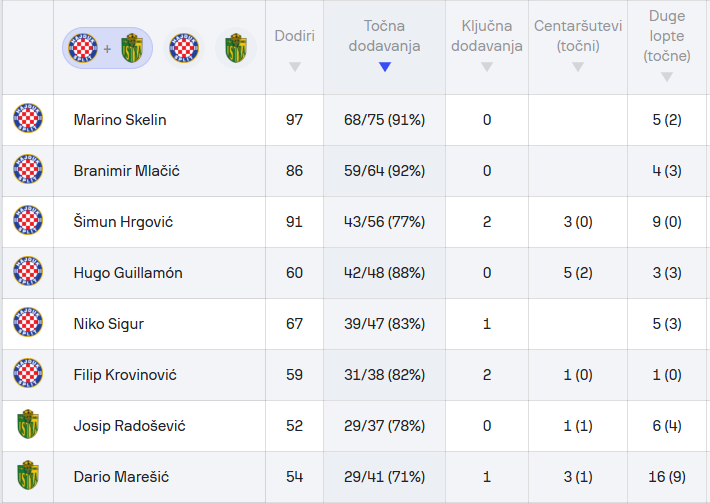 Posjed je bio na strani Hajduka s 63% naprema 37%, pa ne treba čuditi da u distribuciji lopte prevladavaju Hajdukovci i najbolji su bili redom: Skelin (66 od 75 dodavanja – 91%), Mlačić (59 od 64 – 92%), Hrgović, Guillamon, Sigur te Krovinović. Nakon njih slijede 4 Istrina igrača: Radošević, Marešić, Lončar i Frederiksen.