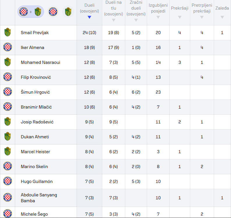 Po pitanju duela Hajduk je tu bio nešto dominantniji te je uzeo 54% ukupnih duela. Hajduk je bio dominantniji na tlu s 60%, a Istra u zraku – isto s 60%. Najviše ih je ostvario Istrin Prevljak s 10 od 24. Drugi najbolji pojedinac na utakmici bio je Iker Almena s 9 od 18. Nakon njega slijedi Nasraoui s 8 od 12, a zatim Hajdukovci Branimir Mlačić 6 od 10, te Hrgović i Krovinović s 6 od 12.