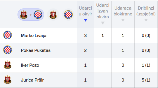 U napadu je Hajduk ušao u protivnički šesnaesterac čak 45 puta, dok je Gorica Hajduku tek 10. Ukupno su gosti uputili 21 udarac, od koji 5 u okvir. Gorica je uputila 6 udaraca, od čega 2 u okvir i jedan je rezultirao pobjedničkim golom. Za Hajduk, 3 udarca u okvir uputio je Livaja, a 2 Pukštas. Za Goricu, jednom je pucao Pršir, a pobjednički pogodak zabio je Pozo.