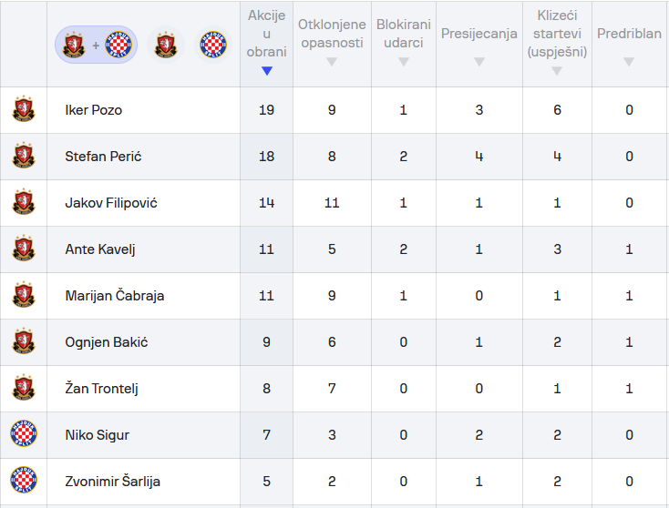 U obrani su sedmorica igrača Gorice predvodili listu igrača s najviše obrambenih akcija. Redom su to Pozo (19), Perić (18), Filipović (14), Kavelj (11), Čabraja (11), Bakić (9), Trontelj (8). Najbolji Hajdukovi pojedinci bili su Sigur sa njih 7 (3 otklonjene opasnosti, 2 presijecanja i 2 oduzete lopte), te Šarlija s 5. Nakon toga imamo Goričinog Čuića, Pršira i golmana Marijaša, pa četvoricu Hajdukovaca koji imaju po tri obrambene akcije: Guillamon, Skelin, Skoko i Pukštas.